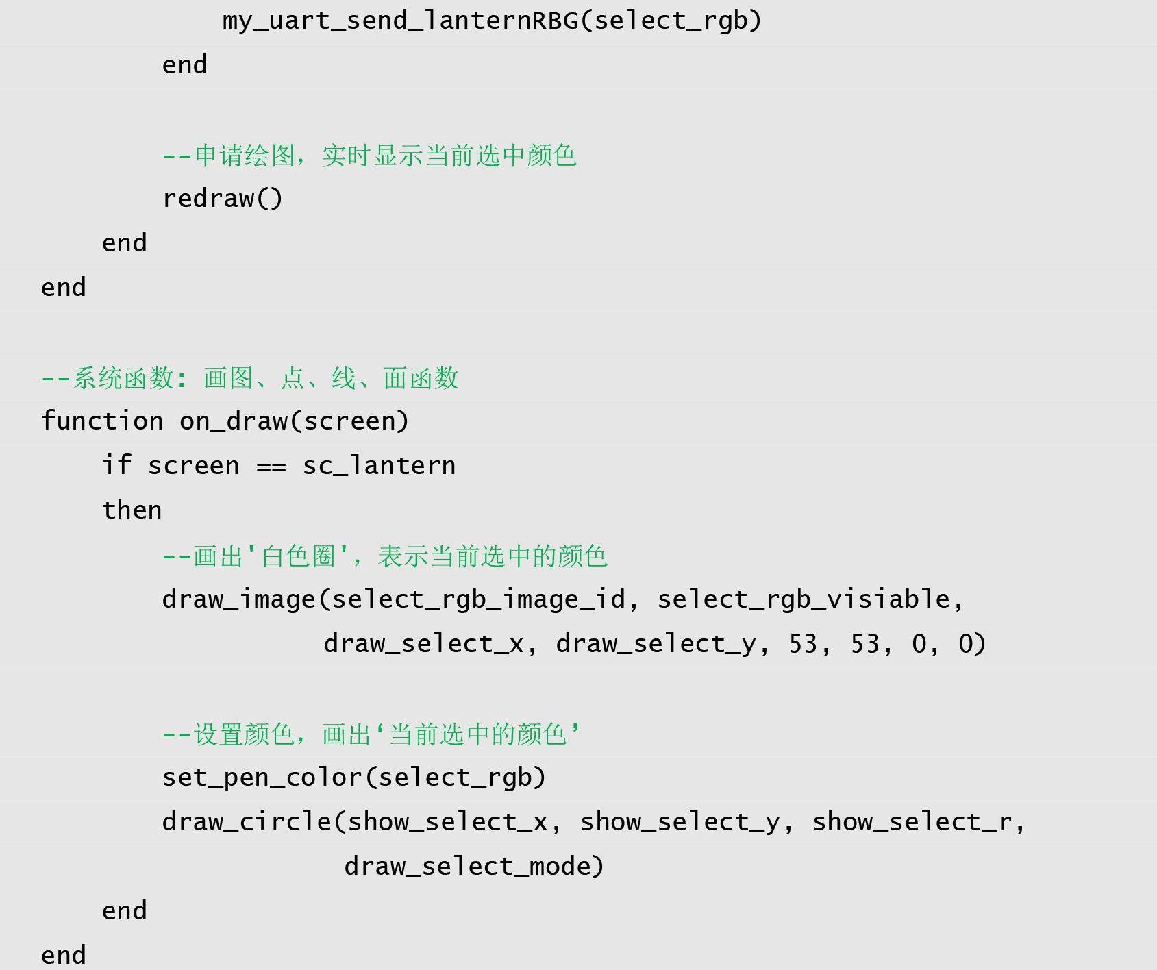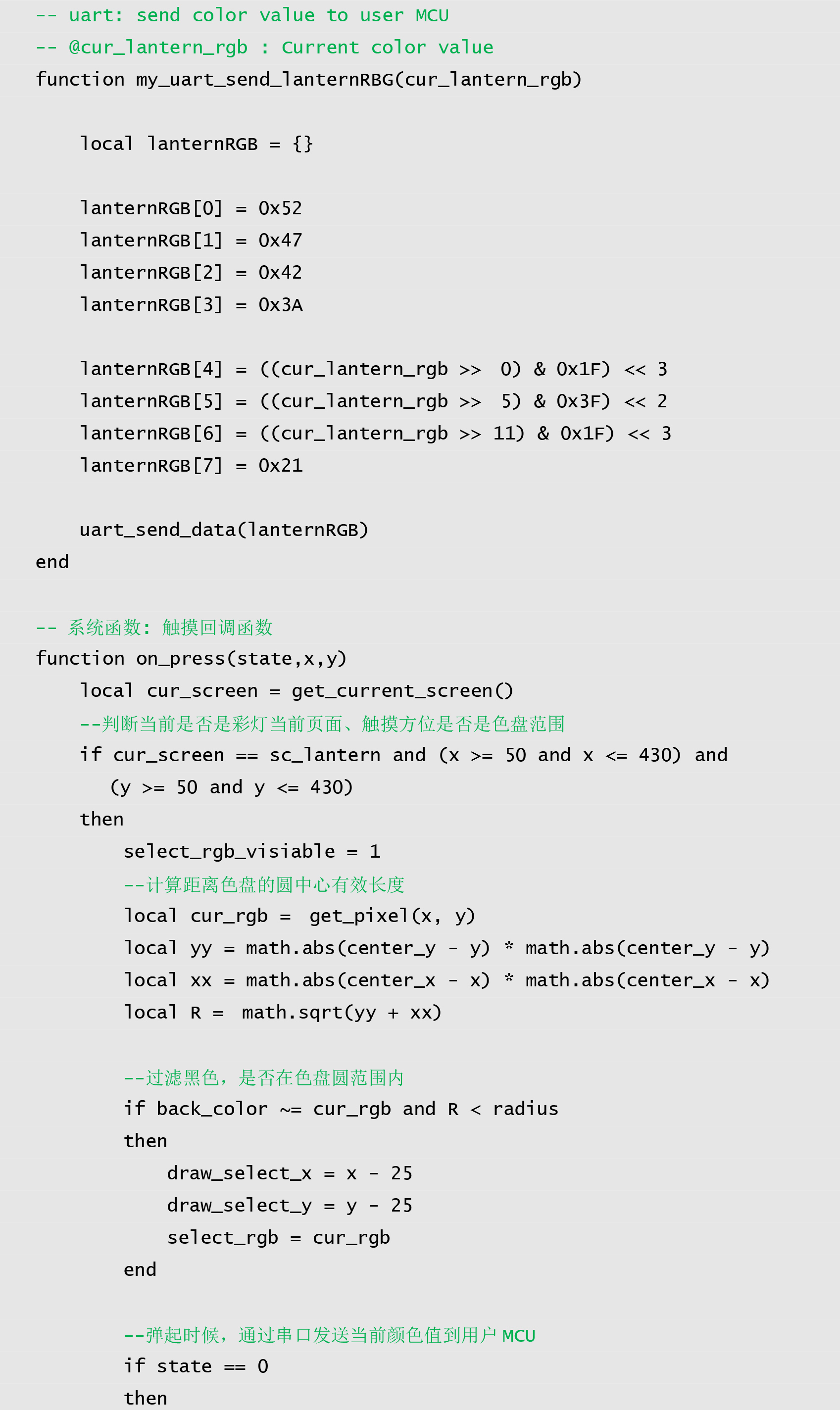 本例程中,用户点击色盘或拖动,右上角有显示预览的效果,当松开后,通过串口发送选中颜色值到用户单片机。代码如程序清单 1所示:
