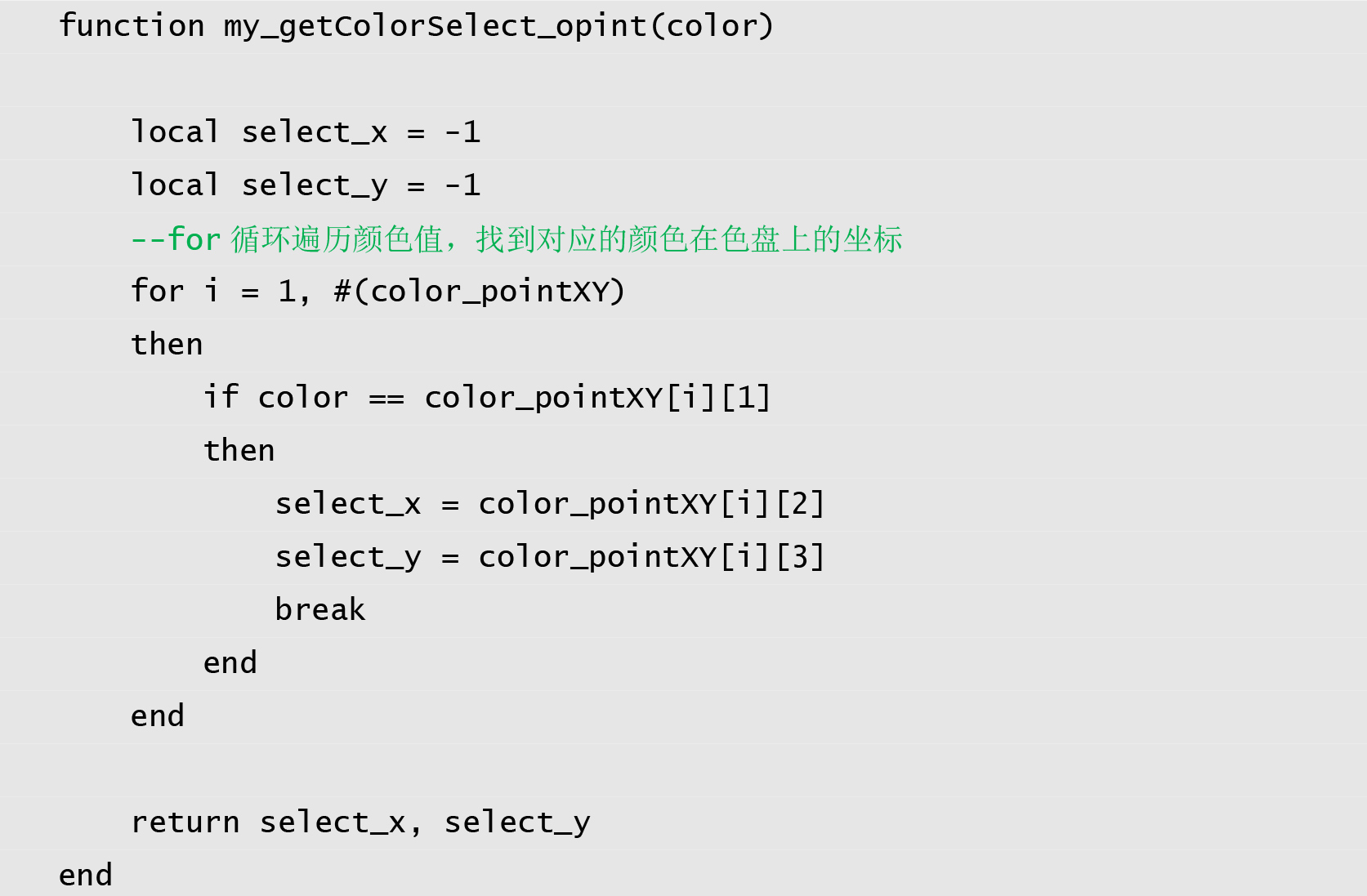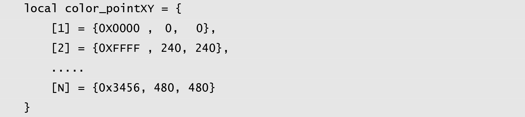 屏幕端,根据色盘的坐标和颜色值,在LUA脚本中建立一个颜色-坐标对照表,如创建一个local color_pointXY = {}的表,如下程序清单 2所示