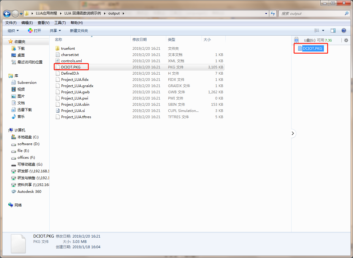 工程编译成功后在输出窗口会提示编译成功,如所示。编译成功后打开工程目录,找到output文件夹,将文件夹中的DCIOT.PKG文件拷贝到U盘中,如图 5-4和图 5-5所示;接上串口屏重新上电,等到提示烧录工程成功后,拔掉U盘重新上电即可。
