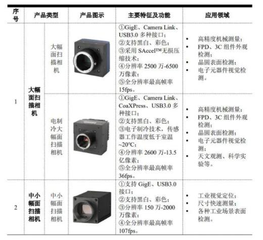 埃科光电是端制造装备核心部件产品提供商,是专业从事工业机器视觉成像部件产品设计、研发、生产和销售的国家高新技术企业。主营业务为工业机器视觉成像部件产品。埃科光电主要产品包括作为工业机器视觉核心部件的工业相机及图像采集卡两大品类,其中工业相机以高速或高分辨率产品为主,工业线扫描相机、工业面扫描相机(含大幅面扫描相机、高速面扫描相机、中小幅面扫描相机);图像采集卡则以兼容Camera Link和CoaXPress等行业标准协议的高速图像采集卡为主。