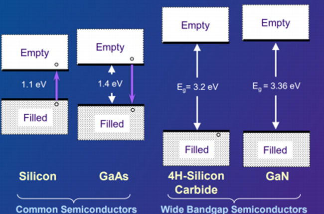 上图体现了第一代、第二代、第三代半导体之间禁带宽度的差异--第三代半导体的禁带宽度几乎是前面两者的3倍。这为第三代半导体带来许多优势,简单来讲就是第三代半导体器件有“三高”:高频率、高功率、高耐温。同时第三代半导体在应用上能够降低能耗、减小体积、减小重量,简单来说是有三低:能耗低、体积小、重量轻。