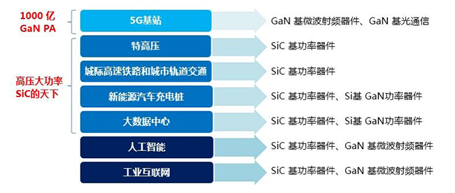 第三代半导体在新基建七大领域都有其广泛的应用前景。在5G基站领域, GaN PA(即氮化镓功率放大器)是5G基站的最优选择,预计在2025年前,我国 5G 宏基站预计将建设超过500万站,而5G宏基站、微基站、及毫米波基站带来的GaN PA 市场规模将超过1000亿元,而特高压、高铁和轨交、充电桩、大数据中心等高压大功率领域都将是SiC的天下。