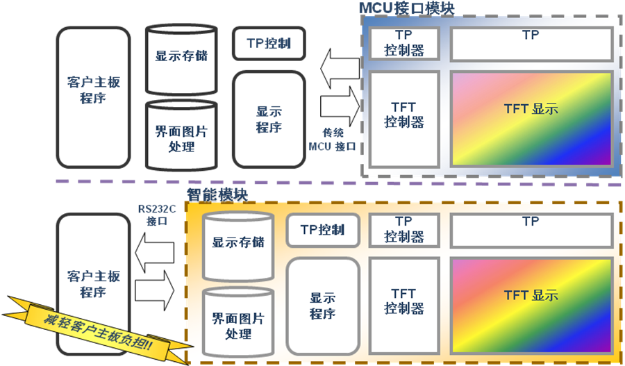 一般而言,显示界面越漂亮越多数据量就越大,对客户主板数据处理能力和传输硬件要求也高,智能TFT液晶模块通过内置数据存储空间、内置数据刷新处理等等,很好的替客户主板数据处理压力和要求,另外客户主板与智能模块数据交互是通过简单串口通讯读写变量而已,更甚者这种变量的读写还无需实时进行,客户主板有空闲时进行即可;换个角度讲,智能TFT液晶模块应用客户主板平台更广泛,简单的可以是传统的51单片机,复杂的可以是工控板,甚至是PC主机。