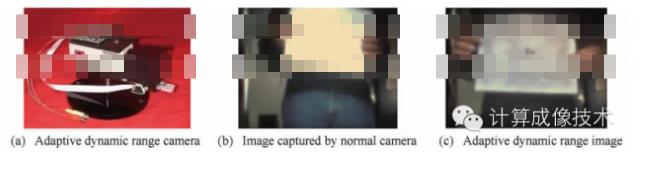 自适应动态范围相机针对特殊场合动态范围变化较大情况下普通相机难以拍摄到清晰图像的问题(如图9(b)所示),在镜头前放置一块液晶面板作为反馈控制器(如图9(a)所示),对摄像机拍摄的图像分析后控制液晶面板进行反馈控制,进而达到自适应动态范围(如图9(c)所示。