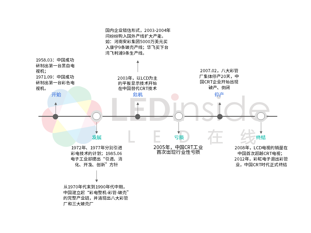 当LCD技术吹响了向CRT技术总攻的号角,身在局中的中国显示企业一来无法准确预判显示技术的走向,二来也不相信LCD能在短时间内取代CRT技术,三来更是缺乏向LCD技术转型的实力和底气。于是乎,在2005年,红极一时的中国CRT产业逐渐衰退,直至2007年,LCD替代CRT的风暴迅速摧毁了中国的CRT产业,中国靠引进、合资建立起来的庞大的CRT帝国,一瞬间被技术前进的车轮碾碎。