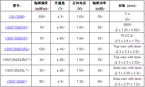 宾夕法尼亚、MALVERN — 2015 年 4 月14 日 — 日前,Vishay Intertechnology, Inc.(NYSE 股市代号:VSH)宣布,发布新型的采用插脚封装和SMD封装的高速940nm红外发射器---VSLY5940、VSMY1940X01、VSMY3940X01、VSMY2940G/RG和VSMY14940*,扩展其光电子产品组合。这些Vishay Semiconductors器件采用Vishay的SurfLight™表面发射器芯片技术,辐照强度比标准的红外发射器高5倍以上,在各种红外照明、数据传输和手势识别应用中可减少元器件数量,提高性能,降低方案成本。