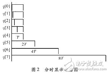 为实现256级灰度,将一个像素点的扫描时间分成19个单位时间t,8 bit灰度数据q[7:0]从高位到低位所占的时间分别为8t,4t,2t,t,t,t,t,t。为使不同位显示时间成一定比例,从q[3]开始引入 t/2的消影时间,q[2]引入t/4的消影时间,d[1]引入t/8的消影时间,d[0]引入t/16的消影时间,如图2所示,由控制电路产生消隐信号进行消隐。由此计算OLED屏亮度百分比λ=(8+4+2+1+1/2+1/4+1/8+1/16)/19=83.9%。