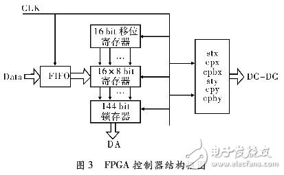 如图3所示,经解码后的图像数据存入FIFO(First In First Out)缓存中,在主时钟的控制下,FIFO中的图像数据将被载入到一个16×8的数据装载寄存器,当这16个8位数据装载寄存器装满时,将被一个144 位的锁存器锁存,等待进入D/A转换模块;同时FPGA控制器还将在主时钟的控制下产生行列移位时钟和行列扫描起始脉冲,产生的时钟和脉冲进入DC-DC 转换模块。