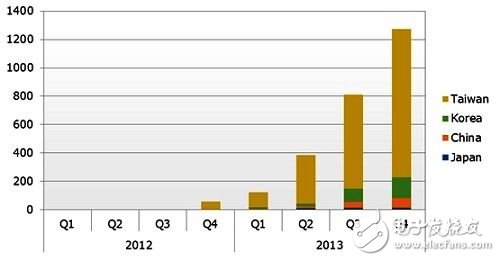 2012年第一季到2013年第四季4K液晶电视面板出货预测,按区域别