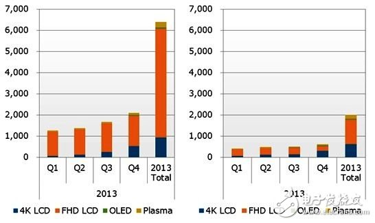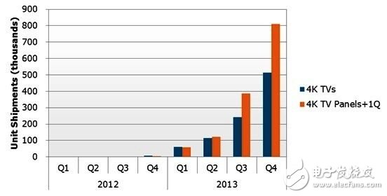 2013年4K液晶电视面板的出货量预计达260万片,但最新NPD DisplaySearch发布的4K电视整机预测,全年需求仅约100万台。通常面板的出货量会领先整机出货一季,但是当前预测显示面板厂对于4K出货高期待,与品牌预期的目标有很大差异,由此也反映了面板厂的雄心大略。