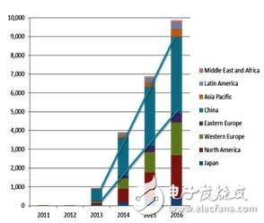 2012~2016年 4K电视出货量按地区别预测