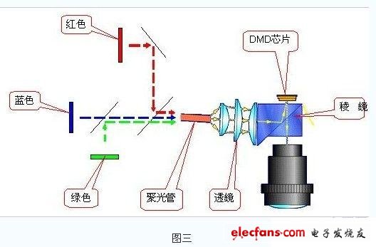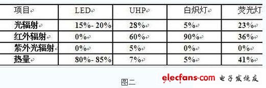 LED光源由于光谱特性,导致在同等亮度的情况下,光源部分产生的热量要高于UHP(见图二)。所以其对于整个投影显示单元的散热设计要求以及环境温度的控制要求也就更高。目前主流的散热方式主要是风冷式和水冷式两种。应该说各有优缺点。风冷式比较传统、成熟,水冷式散热效率略高于风冷式,但是设计难度较高,长期使用的可靠性有待检验。