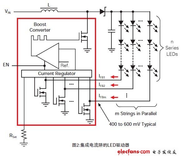图2显示了集成电流阱的驱动器。该驱动器对每个电流阱的电压进行采样,确保转换器能够提供刚好足够的功率,以维持电流阱正常工作。
