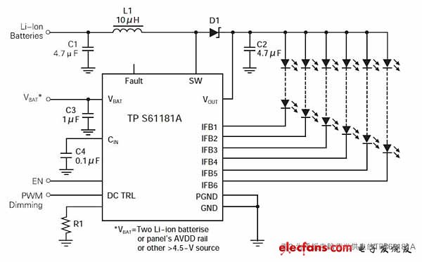 预计,平板电脑市场将从2011年的5000万台,增长到2016年的2亿多台。但尽管如此,到目前为止还没有标准的平板电脑架构。一些平板电脑通过单节锂电池来供电,而另一些则使用两节锂电池。无论使用多少节锂电池,所有平板电脑制造厂商都想最大化地提高电池的使用时间。此外,显示器的背光是平板电脑中最为耗电的系统之一。最近发布的平板电脑中,背光LED的数目范围为20到36支。本文将指导读者如何选择最佳的WLED驱动器和LED串配置,在不牺牲效率和电池使用时间的情况下满足平板电脑的应用要求。