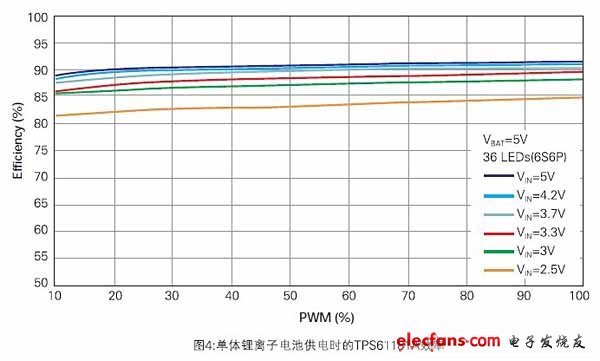 根据前面的分析,具有集成电流阱的背光驱动器,例如:德州仪器TPS61181A笔记本电脑背光驱动器,可以针对平板电脑背光进行优化(参见图3)。对于那些使用两节锂离子电池的平板电脑而言,驱动器和升压功率级都可以直接通过电池供电。而对于那些只使用单节锂离子电池的平板电脑来说,驱动器偏压轨可以由面板的AVDD轨或者系统的另一个电源(4.5V 或者更高)来供电。由于TPS61181A能够提供比大多数平板电脑要求的功率稍微更高一些的功率(也就是说,功率FET稍微过大,因此RDS(on)非常低),所以相比专为该输出功率而设计的转换器,这种转换器的功耗更低,从而进一步最大化了效率。图4显示了6S6P配置TPS61161A的测得效率结果。