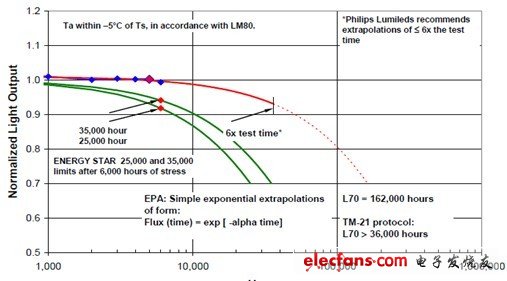 通常对LED老化6000小时测试光通维持率LM(Lumen Maintains),按照指数规律,若6000小时后LM >91.8%,便可宣称25,000小时的寿命,若LM>94.1%可宣称35,000小时的寿命,但寿命推算的时间不超过测试时间的6倍。