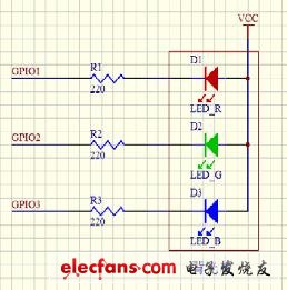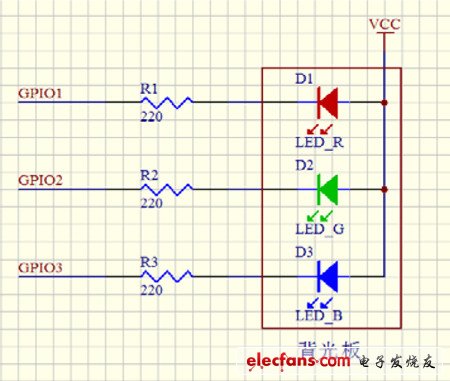 传统7色背光设计方法,7色背光的实现方法,硬件如下。只利用了主控制器的3条GPIO口线,对三个背光LED管子做开关控制。可以很容易实现7种颜色的变化。