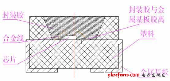 同时,发现造成此种现象的灯珠都是直接或间接地裸露在空气中点亮,空气中存在有水汽。由此可以推断出,LED支架的防湿气结构做得不好,导致湿气渗入灯珠内,从而造成封装胶在LED灯珠长期点亮的环境下易与金属基板脱离,使得拔断焊接在金属基板上的合金线,从而形成电路断开。