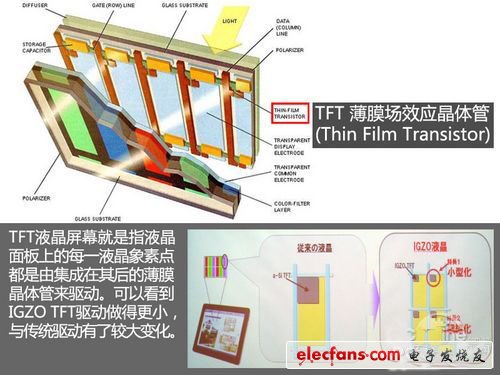 TFT(Thin Film Transistor)是指薄膜场效应晶体管,TFT液晶屏幕就是指液晶面板上的每一液晶象素点都是由集成在其后的薄膜晶体管来驱动,也就是曾经在手机领域上经常听到的“TFT屏幕”。常见的TFT驱动分类主要有a-Si TFT(非晶硅)、LTPS TFT(低温多晶硅),IGZO TFT也属于这一范畴。所以说到底,夏普这次所提出的IGZO面板,仍然是一种TFT液晶屏幕,其实IGZO TFT技术也可以使用在OLED面板上,在这里就不多说了。