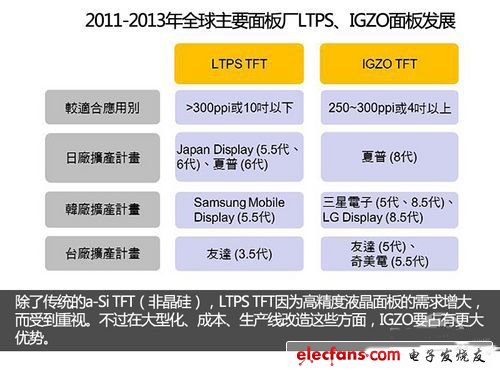 其次再介绍一下a-Si TFT和LTPS TFT两种技术的特点,好让大家更好地了解IGZO的意义。传统的a-Si TFT(非晶硅)是目前使用最广泛的技术,覆盖大部分手机、平板、笔记本的屏幕和几乎所有的液晶电视屏幕。而LTPS TFT技术则应用在中小尺寸的高精度液晶面板上(比如HTC One X就应该使用了这一技术),ppi最高可实现500以上,其电子迁移率大约是a-Si TFT的100倍。