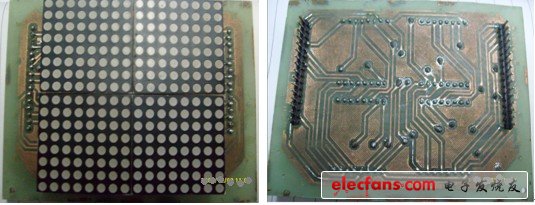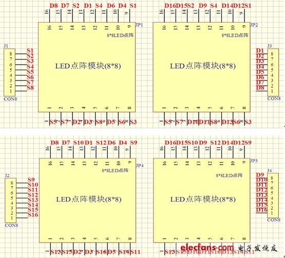 为了方便调试本文把4块8*8组成的16*16的点阵屏的行信号扫描输出管脚和列信号显示输出管脚分别引到显示屏的两边。