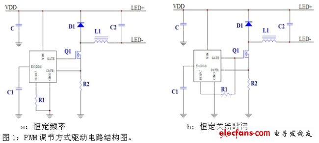 按照PWM调节方式,可以分成恒定频率和恒定关断时间两类(图1)。