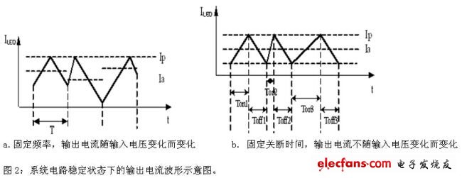 从电感的计算公式可以看出这两者之间的差异性,图1a中的电感计算式为L = (Vin–Vo) * Ton /ΔI ,图1b中的电感计算式为L=Vo*Toff/ΔI。Io=Ip-ΔI /2。如图2所示电流波形示意图,电感确定后,图2a中输入电压Vin变化导致纹波电流ΔI变化,以致输出电流变化;图2b中的纹波电流ΔI与输入电源电压无关。因此在电压波动较大的宽电压应用环境下,使用恒定关断时间电路方式。