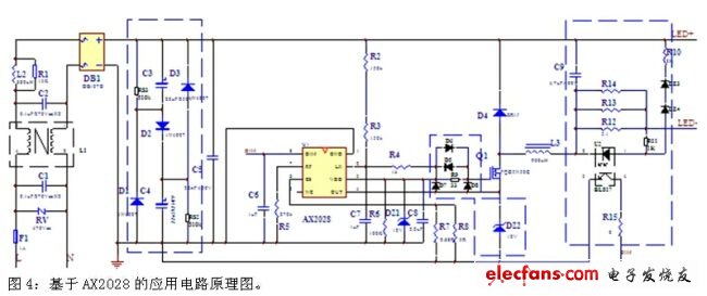 电路采用了EMI抑制电路、整流滤波电路、填谷PFC电路、AX2028恒流系统电路来驱动LED工作。