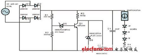 电容C1两端之电压维持在80 V与90 V之间。C1存储的电荷为恒流稳流器(CCR) (NSI45020AT1G)及LED串(此电路示例中含22颗LED)供电。CCR将LED串的电流维持在20 mA。电路中包含与LED串联的电阻R4 (10 Ω, 1.0 %),用于测量LED串电流(200 mV = 20 mA)。