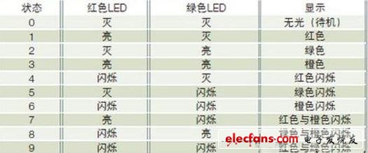 State 0是待机模式,LED熄灭。此时设备在等待按下开关。LED颜色指示出以下的三个状态。例如,Kingbright公司的WP5A9EGW12.3SF LED可发出红、绿、橙颜色。加上闪烁就可指示其余的状态。红色与绿色LED可以分别独立地控制,从而获得六种指示组合(表1)。