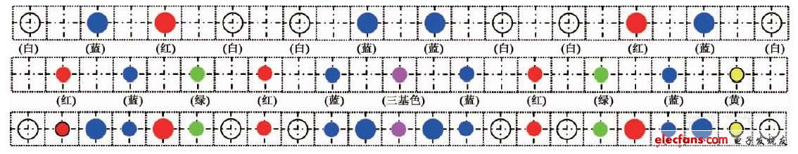 根据水生动植物对光选择性吸收的事实,确定了“LED 水族照明光源”的主光谱辐射区。突破传统的点、线光源技术缺陷,LED 组合灯具采用模组式设计,由1 组主灯条( 3W 的4 蓝、6 白、2 红LED) 和1 组月光灯条( 1W 的4 蓝、3 红、2 绿、1黄、1 三基色LED) 组成( 见图3) 。每个灯珠装配30°聚光帽,配合两侧纳米反光条,使光线最大程度的集中于水族箱内,由于灯具是点射光,水面的波纹折射出阴影,可模拟大自然波光粼粼的效果。