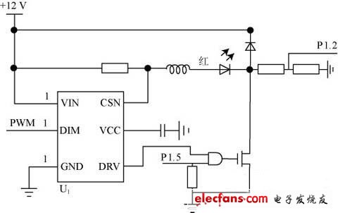 LED灯控制模块根据场景设置需要完成LED灯的开关、调色、调光。LED灯目前通常采用1W 或3W的灯珠封装而成,透过不同的荧光粉LED灯珠可发出不同颜色的光。LED灯珠的封装方式有串联、并联、混联三种,可根据景观照明的色彩需求与亮度要求选择LED灯珠封装方式。景观照明系统中为达到更好的色彩还原性,系统中采用红(R)、绿(G)、蓝(B)三种颜色灯珠统一封装混联模式。LED灯控模块控制RGB三种颜色灯珠的亮度,通过透镜后形成多种色彩。控制LED灯珠亮度可以通过改变LED灯珠电流与调整LED灯珠点亮时间两种方式实现,相对改变电流调整方法,利用LED高闪断特点改变LED点亮时间更加简单且容易实现,是当前主要采用的调整灯珠亮度的方式。图2为LED灯中一路灯珠(红色)的控制原理示意图,集成电路U1是恒流源芯片(XLT604),同时为红、绿、蓝三色灯珠提供电源,PWM 引脚控制产生恒流源电流大小。MCU 的P1.5发出PWM 信号,占空比不同导致红灯珠点亮时间不同,从而使得红灯珠发光亮度不同,MCU P1.2引脚的高低电平则用于判断红灯珠是否损坏。