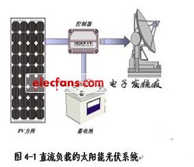 图4-1是一个典型的供应直流负载的光伏系统示意图。其中包含了光伏系统中的几个主要部件:光伏组件方阵:由太阳电池组件(也称光伏电池组件)按照系统需求串、并联而成,在太阳光照射下将太阳能转换成电能输出,它是太阳能光伏系统的核心部件。