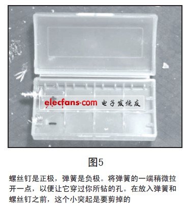 5. 用钳子把一根弹簧的一端拉开一点,从电池盒内部插进第三个孔,旋转大约一圈半,用同样的方法把另一根弹簧插进最后的那个孔(见图4,图5)。