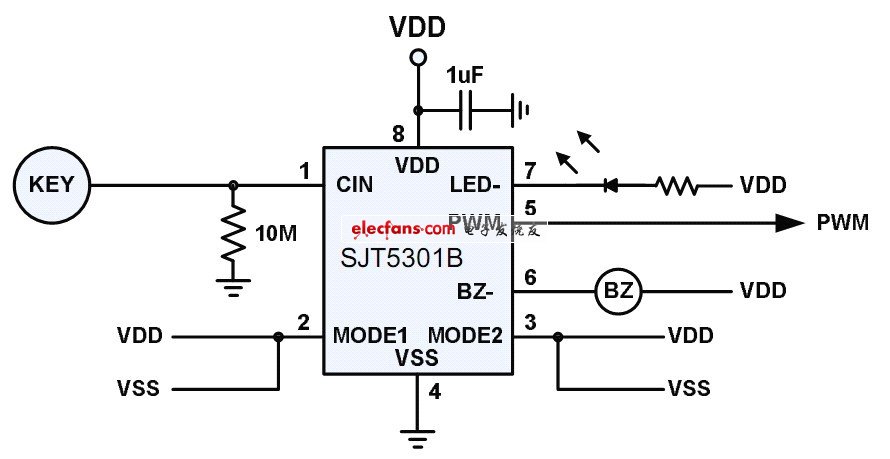 触摸感应生效提醒,连接内振荡型蜂鸣器(有源蜂鸣器)的负极;当手指接近感应电极并检测生效时,BZ-输出低电位脉波,蜂鸣器发出一声短暂的Be音。在分段调光模式(二段或三段),若触按感应电极超过2秒,BZ-输出连续两个低电位脉波,蜂鸣器发出Be-Be两声提示音,作为定时关闭功能的启动提示。在连续调光(无段调光)模式,若触按感应电极超过2秒,BZ-输出一个低电位脉波,蜂鸣器发出一声Be音,作为开始连续调光的提醒。