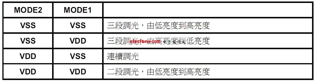 MODE1和MODE2都接到VSS时,设定为三段调光模式,PWM分为三段:ON→25%→50%→100%→OFF,如此循环。在三个阶段都可以启动定时功能。