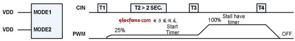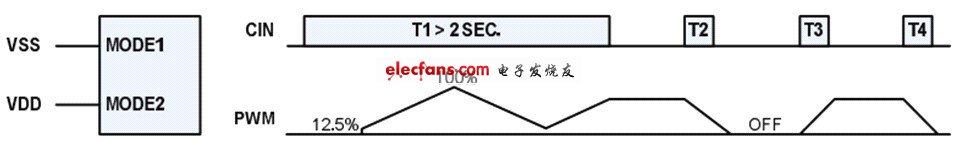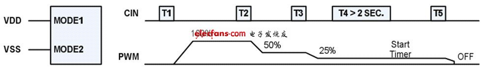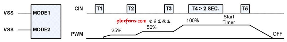 MODE1和MODE2都接到VDD时,设定为二段调光模式,PWM分为两段,ON→25%→100%→OFF,如此循环;在两个阶段都可以启动定时功能。