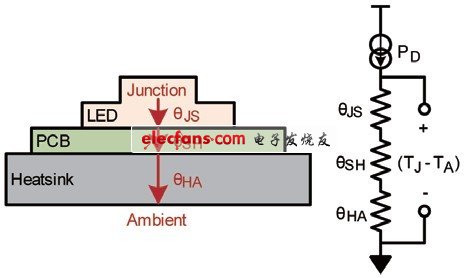 θJS代表内部的LED热阻,而θSH代表印刷电路板(PCB)电介质和结点热阻。最后,θHA代表散热器热阻,θJS值为LED制造商数据表中指定值,并且是一个简单的LED封装函数。它可以在2~15℃/W的范围内变化。假如从锡焊点到散热器的连接良好(包括:多重热导通孔,适量的铜,良好的焊接和可能用到的导热胶),θSH则基本上可以忽略不计。这将产生一个小于2℃/W的极低θSH值。