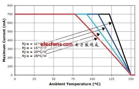 每个LED制造商都提供了对应环境温度变化的最大前向电流的特性曲线。如图2所示的Cree XRE系列曲线,该曲线标明了推荐的LED过温安全工作范围(SOA)。这个快速的参考设计资料提供了多重θJA图形。因为在数据表规定了θJS,而在运行良好的系统中可以忽略θSH,因此θHA是一个可控变量。对于给定的θHA,维持LED驱动电流在限定范围内,可防止LED在非安全状态下运行时会出现的热逸散和/或大幅的寿命衰减。