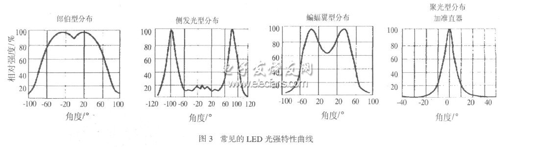 随着LED 技术的快速进步,性能指标有了显着的提高。特别是作为第四代照明主流的大功率白光LED的性能有了很大的提高。依据使用要求的不同,以单片封装的功率来区分:从1~10W 直到上百瓦、几百瓦不等;从LED 封装透镜的配光输出光强特性来区分,主要有:朗伯型、侧发光型、蝙蝠翼型、聚光型(准直)等类型,输出的特性曲线如图3 所示。