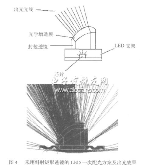 采用斜射矩形透镜封装配光的原理及光输出模拟(参见图4)。主要研究结论是: