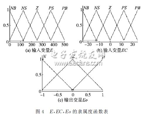 e的基本论域为[0.500],语言变量E的论域X=[NB,NS,Z,PS,PB];ec的基本论域为[-25,25],语言变量EC的论域B=[NB,NS,Z,PS,PB];输出函数eo的基本论域为[-1,1],语言变量Eo的论域Z=[N,Z,P]。输入、输出变量的隶属度函数均采用三角形,图4所示为E,EC,Eo的隶属度函数表。对于两输入单输出的模糊控制模型而言,控制规则可以写成: