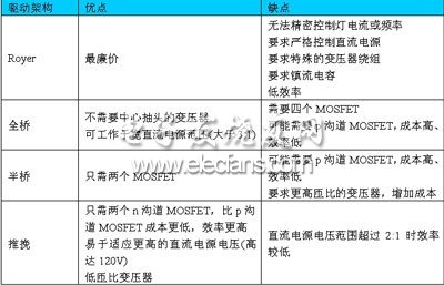 可以用多种架构产生驱动CCFL所需的交流波形,包括Royer(自振荡,self-oscillating)、半桥、全桥和推挽。表1详细归纳了这四种架构各自的优缺点。