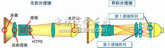 通过“第1透镜阵列”、“第2透镜阵列”,将从光源 灯发出的光线明亮地照射到屏幕的各个边角的技术。