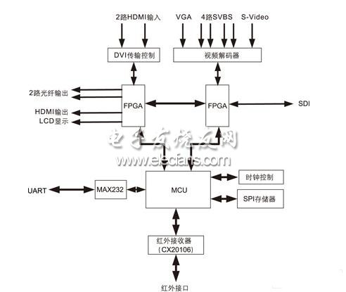 根据LED显示屏需具有较高的显示性能和效果,以及方便控制的需求,显示屏控制系统应具有足够的输入、输出接口和远程通信功能。我们基于HDMI 1.3技术的LED显示屏控制器的系统结构如图1所示。系统按功能可分为以下几个模块:6路模拟量输入、2路DVI输入、1路VGA输入、RS-232和 RS-485通信、光纤数据传输、实时时钟以及状态指示等。