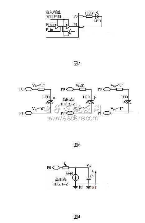 作为光电探测器的LED能够工作在两种检测模式下:光伏模式(在外界光的作用下器件有产生电压的能力)和光导模式(器件的导电性受外界光的控制)。在两种检测模式下产生的光电压或者光电流通常大约是普通光电二极管的1/100~1/10,一般需要借助于运放和ADC。而在没有运放和ADC的情况下,能否获取LED的光电流呢?事实上利用二极管本身的内电容(通常为pF级),带有高阻态的三态双向I/O口及内部数字计数器的单片机也可以用来对其所产生的光电信号进行很好的测量。
