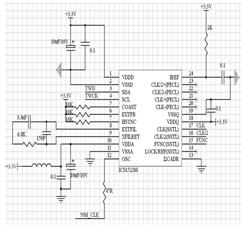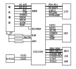本卡S1D13506与处理器的接口采用了通用类型总线(包括数据总线、地址总线、控制总线)接口定义见表1。芯片所用象素时钟是由同步信号发生器ICS1523来提供的,外接1M*16的EDO-RAM(IS41LV16100 )。图1所示的是显示卡硬件总体连接图。连接到CPU的信号有: A1-A21、D0-D15、WR0#、WR1#、RD#、CS#、RST#、时钟、WAIT#;连接到时钟发生器的信号有:CLK1、CLK2(用于内部显示及外部媒体接口时钟);连接到EDO-DRAM的信号有:DRAM-WE、DRAM-RAS、LCAS、UCAS、MA0-MA9、MD0-MD15(其中MD1/MD2/MD4/MD6/MD15需要外接上拉电阻用于S1D13506初始配置);其他控制信号连接到LCD/CRT。S1D13506芯片有个测试使能引脚TESTEN在芯片正常工作时接地。如果不使用DAC功能,那么IREF引脚必须接地。图2为同步信号发生器ICS1523的外部连接电路[3]。 ICSl523通过I2C串行总线(TWD、TWCK)接受微处理器MPU对它进行寄存器配置。本显示卡的ICSl523输入时钟 是50 MHz、输出CLKl (25 MHz)、CLK2(12.5 MHz)。本卡引出了LCD的全信号有利于连接不同的LCD屏和CRT的控制信号。