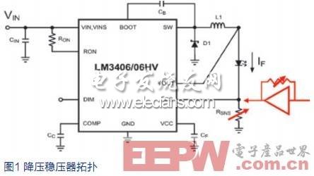 图1显示采用降压拓扑的一个 LED驱动器。Vin必须始终高于LED 和RSNS上的电压之和。电感电流为LED电流。该电流通过监控CS引脚的电压进行调节。当CS开始低于设置的电压时,流经 L1、LED和RSNS的电流脉冲的占空比增加,从而增加LED的平均电流。