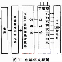 首先应用74LS112和74LS74中3个触发器构成异步八进制加法或减法计数器;再将输出端Q2Q1Q0分别与74LS138(3-8译码器)的地址码输入端A2A1A0相连,使译码器相继译码。其电路组成框图如图1所示。