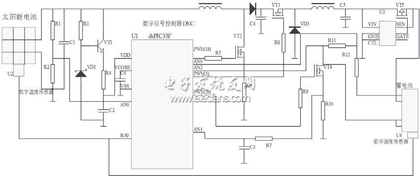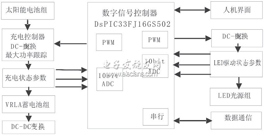 dsPIC33F系列DSC全面支持数字控制系统,丰富的PWM控制和ADC转换功能特别适合DC/DC转换、电源管理和LED照明控制系统,可满足本设计对太阳能电池组、蓄电池组MPPT、充放电控制、DC/DC转换控制和LED照明驱动的控制管理。